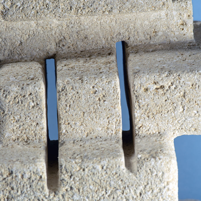 Tête de roi et socle métal vue de quart arrière sur fond bleu